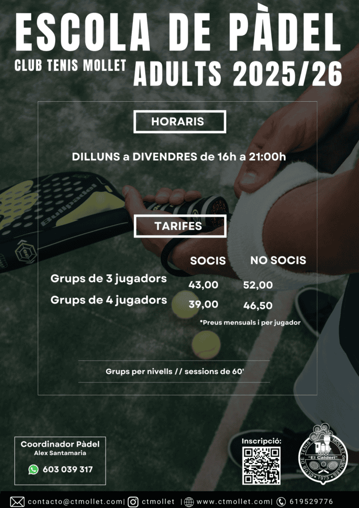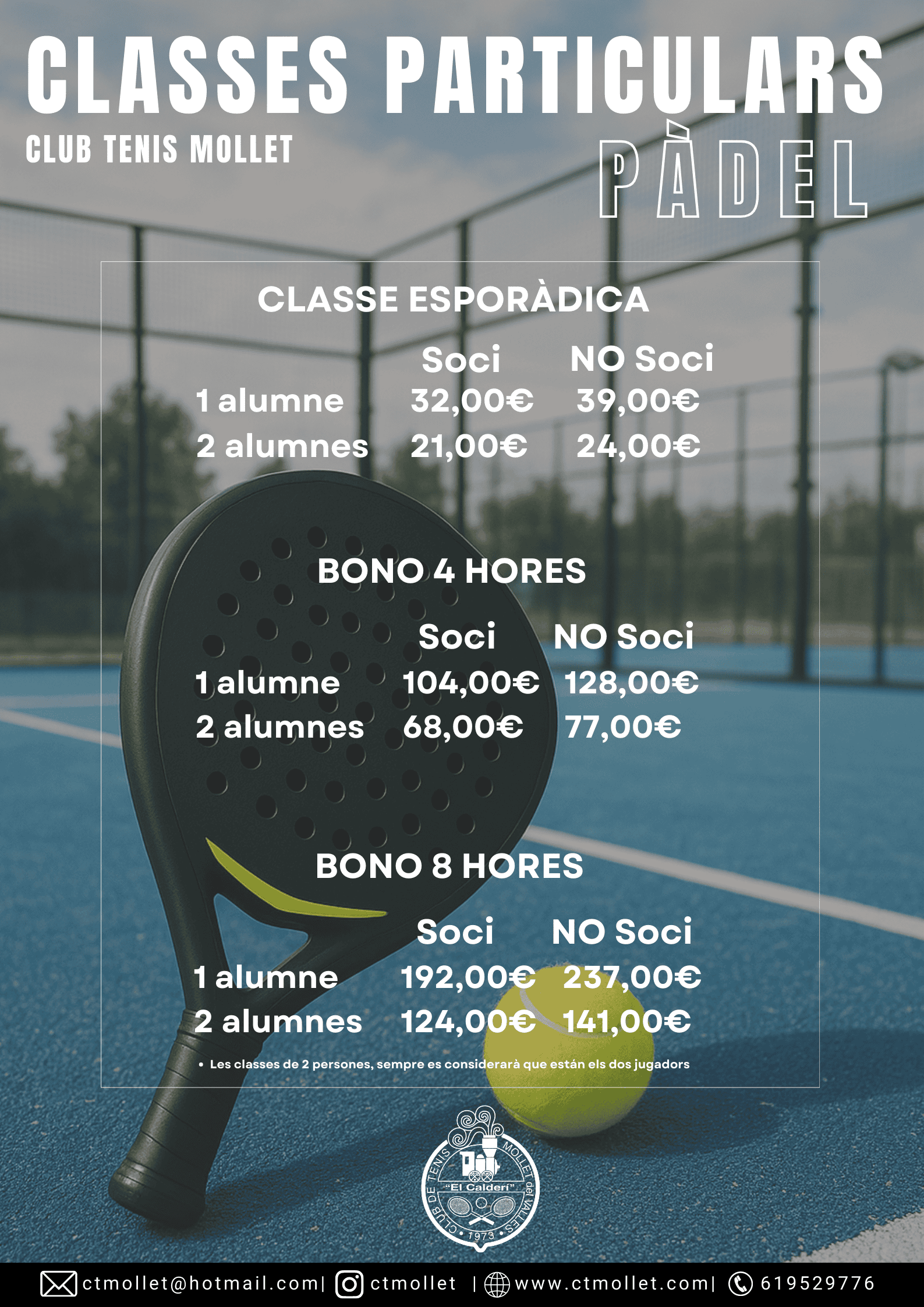 El Club Tenis Mollet també ofereix classes particulars adaptades a tots els nivells per aquelles persones que desitgin millorar els moviments bàsics per començar a jugar o millorar el teu nivell de tenis.